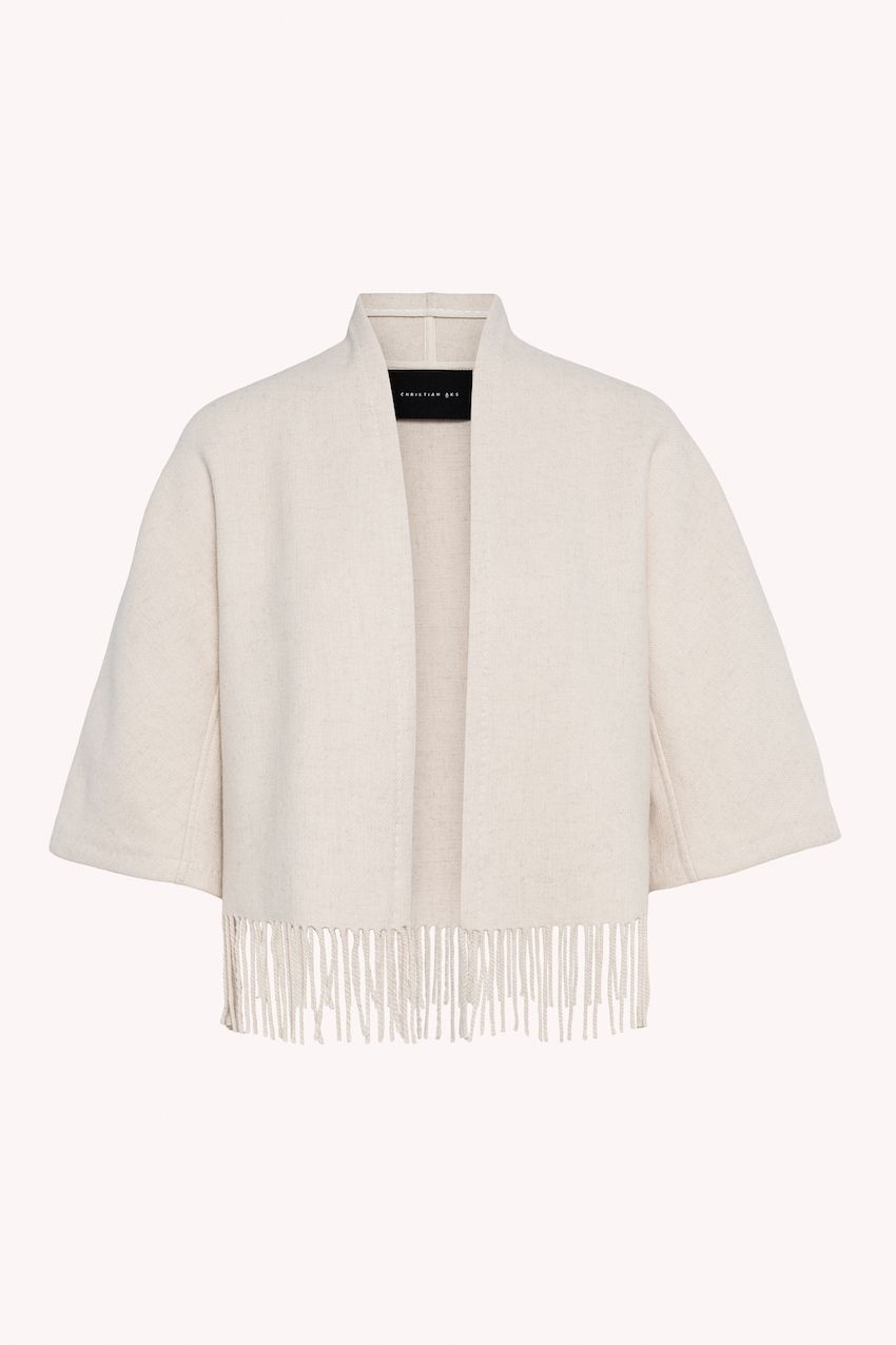 Christian Aks Keyla Jakke laget av en myk lammeull. Et rent og tidløst design med frynser nederst. Interiør ferdig med bomullspiping. Perfekt å ha på både innendørs og utendørs.