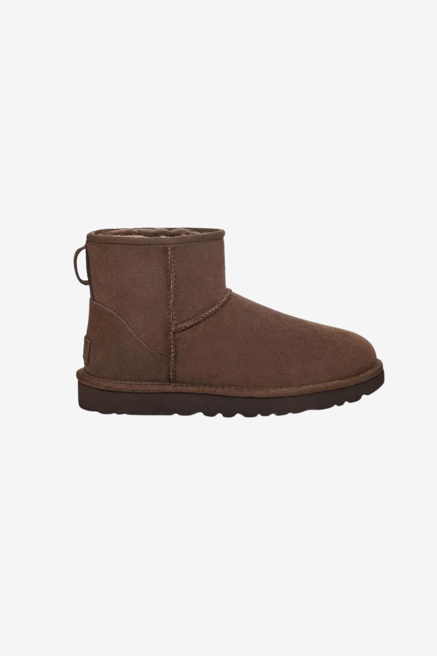 W Classic Mini II fra UGG. Classic Mini II kombinerer et tidløst design med den kjente varmen og komforten UGG er kjent for. Skoene er laget av semsket skinn med mykt ullfôr på innsiden, og har en lett og fleksibel såle som gir god demping. Hempe bak gjør dem enkle å ta på, mens vannavstøtende behandling beskytter mot lett fukt. Avsluttes med den klassiske logopatchen på hælen.