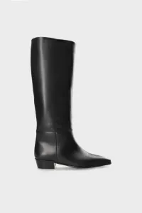 Disse høye støvlene i svart skinn gjenskaper rene linjer. Den rektangulære hælen og den firkantede tåen møter den slående overflaten – en spennende kontrast som gir dybde og karakter til denne klassikeren.