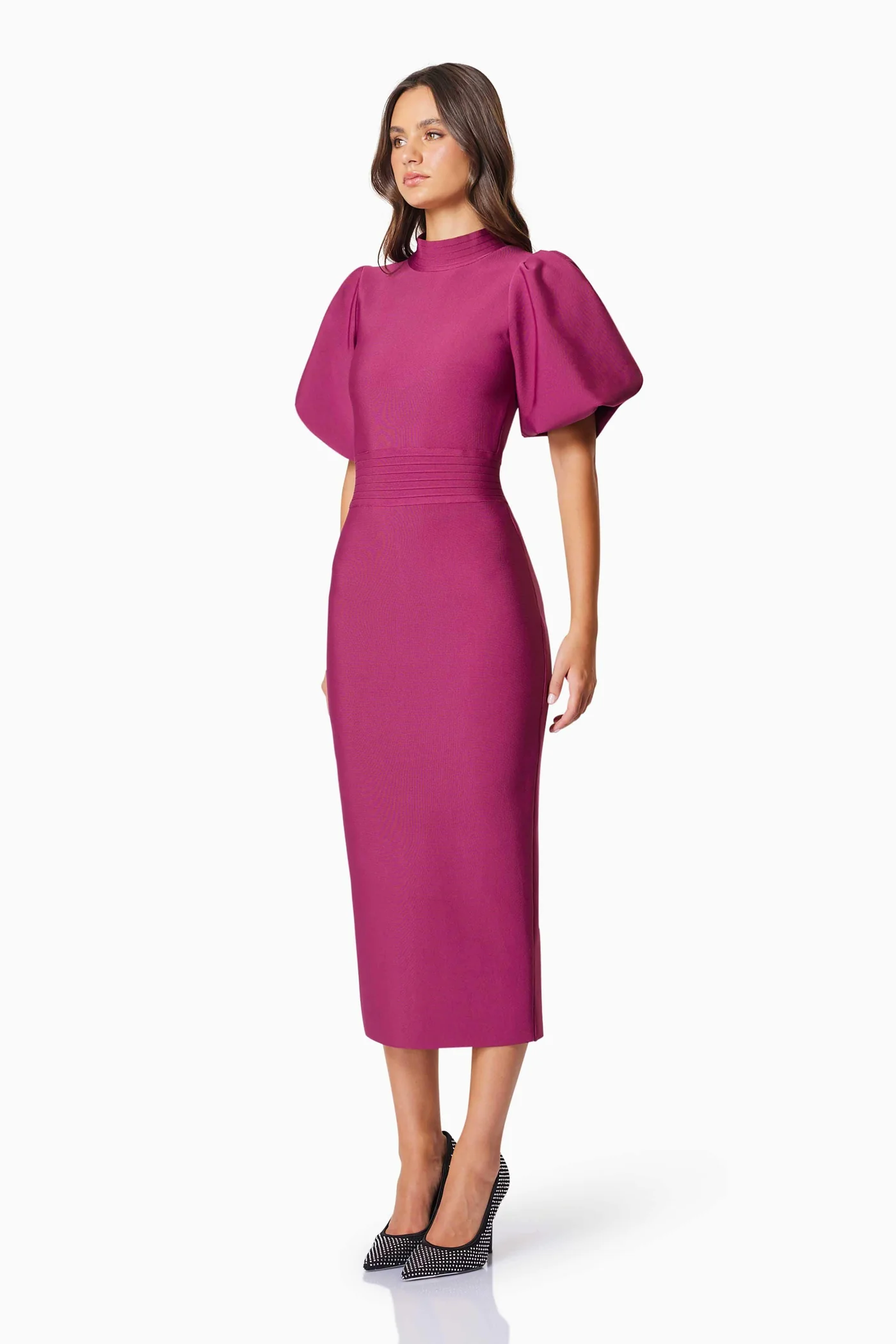 Elliatt Ella Midi Dress er en elegant midikjole som er perfekt for enhver sofistikert anledning. Kjolen har en kroppsnær passform, god stretchkvalitet og en delikat kutt som fremhever dine naturlige former på en stilfull måte. Den tilpassede midjen skaper en flatterende silhuett, mens de korte, puffede ermene tilfører et moderne preg til kjolens tidløse design.