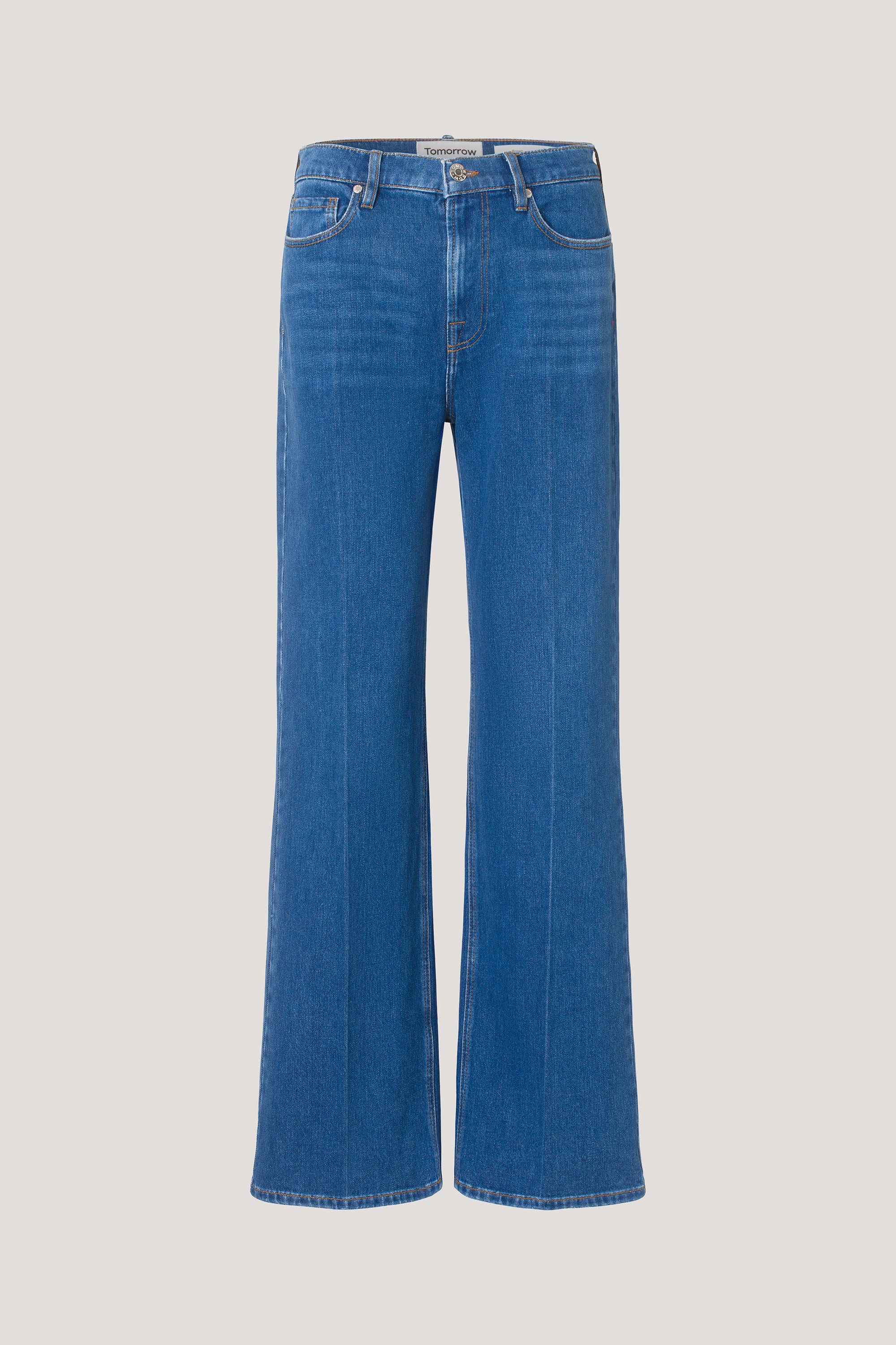 Disse 5-lommers jeansene har høy midje og brede, rette ben hele veien ned til fotenden. Denimstoffet er vasket i en original blå dongeri farge.